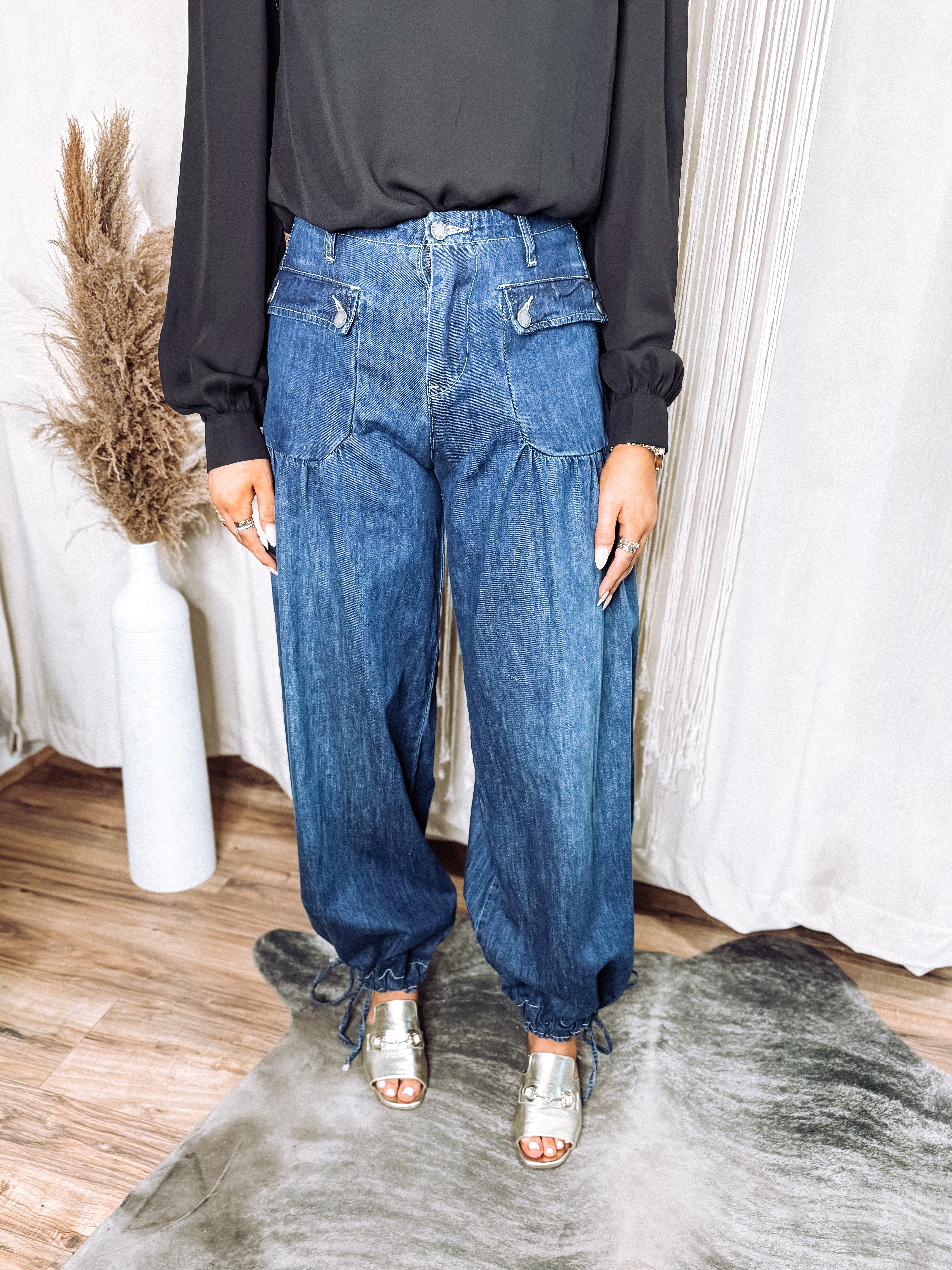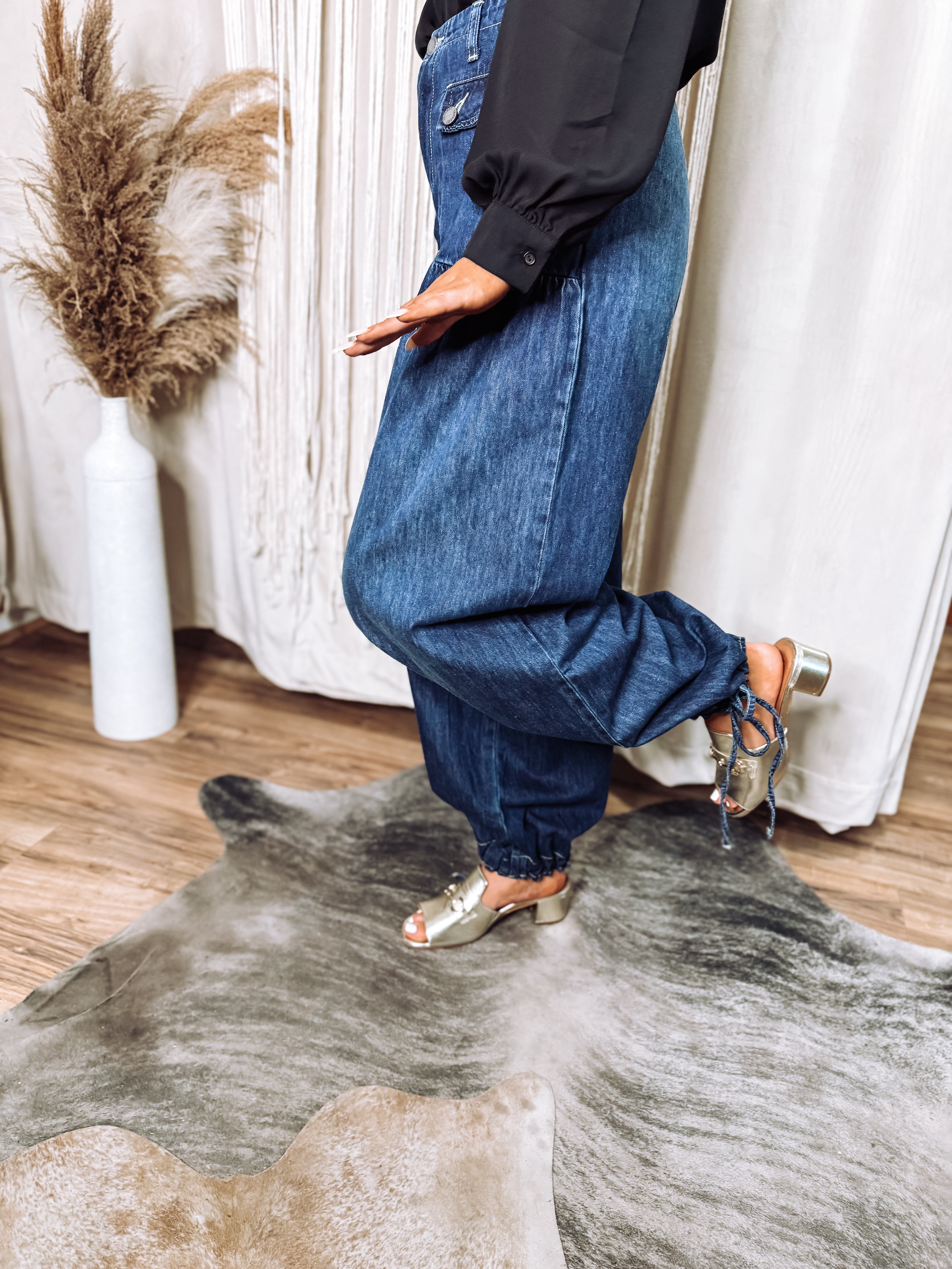 The structured denim keeps everything polished, while the adjustable ankle drawstring lets you style them loose or cinched depending on the vibe. Comfortable, intentional, and quietly statement-making.