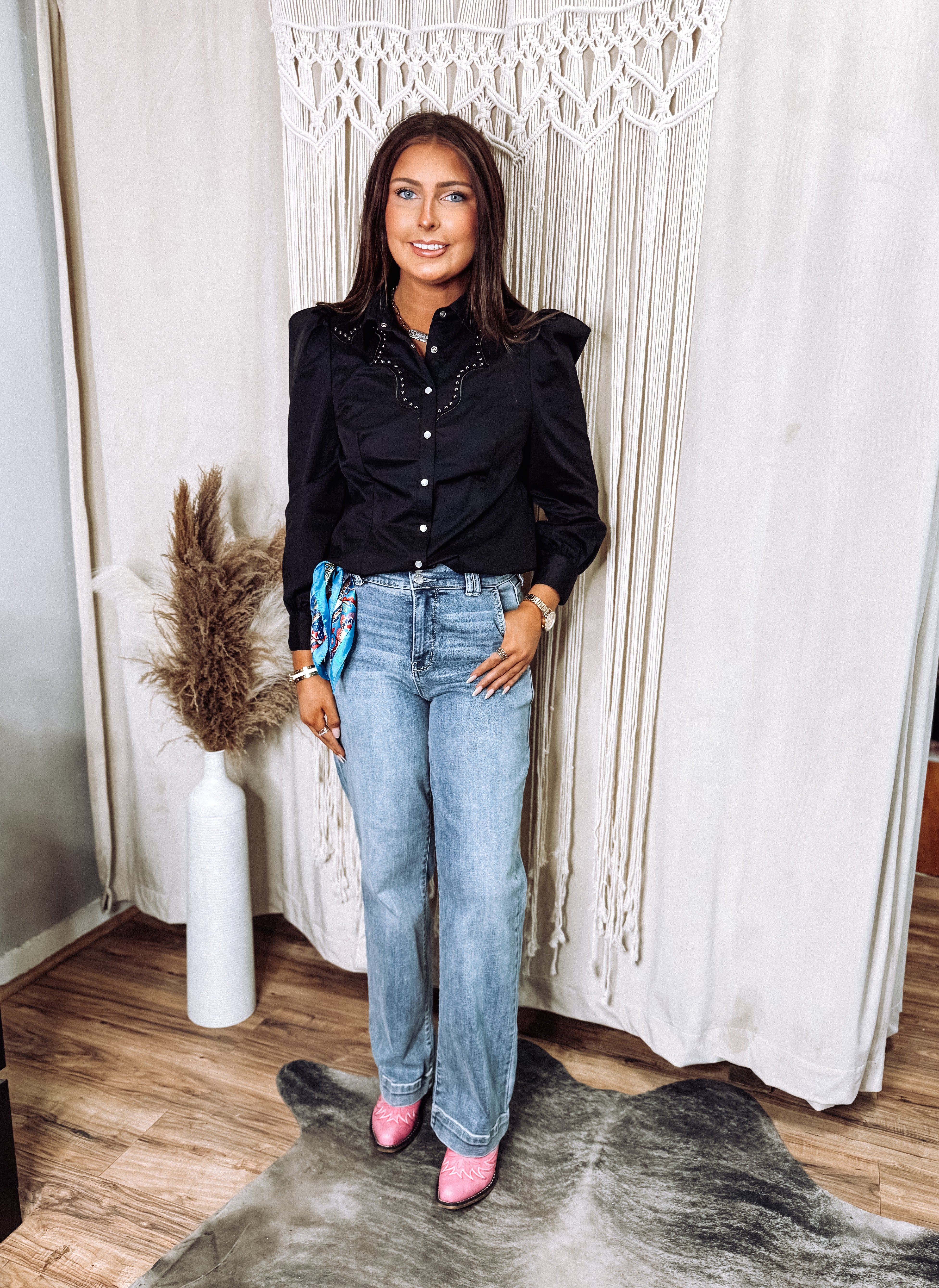 This black pearl snap blouse is what happens when classic Western design grows up and gets polished. The structured cotton blend gives a tailored, put-together look, while puff sleeves and antique silver stud detailing along the yoke add just enough edge. It’s refined, confident, and makes it look like you planned your outfit — even if you didn’t.