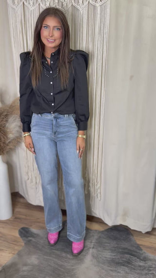Black Puff Sleeve Pearl Snap Yoke Studded Shirt