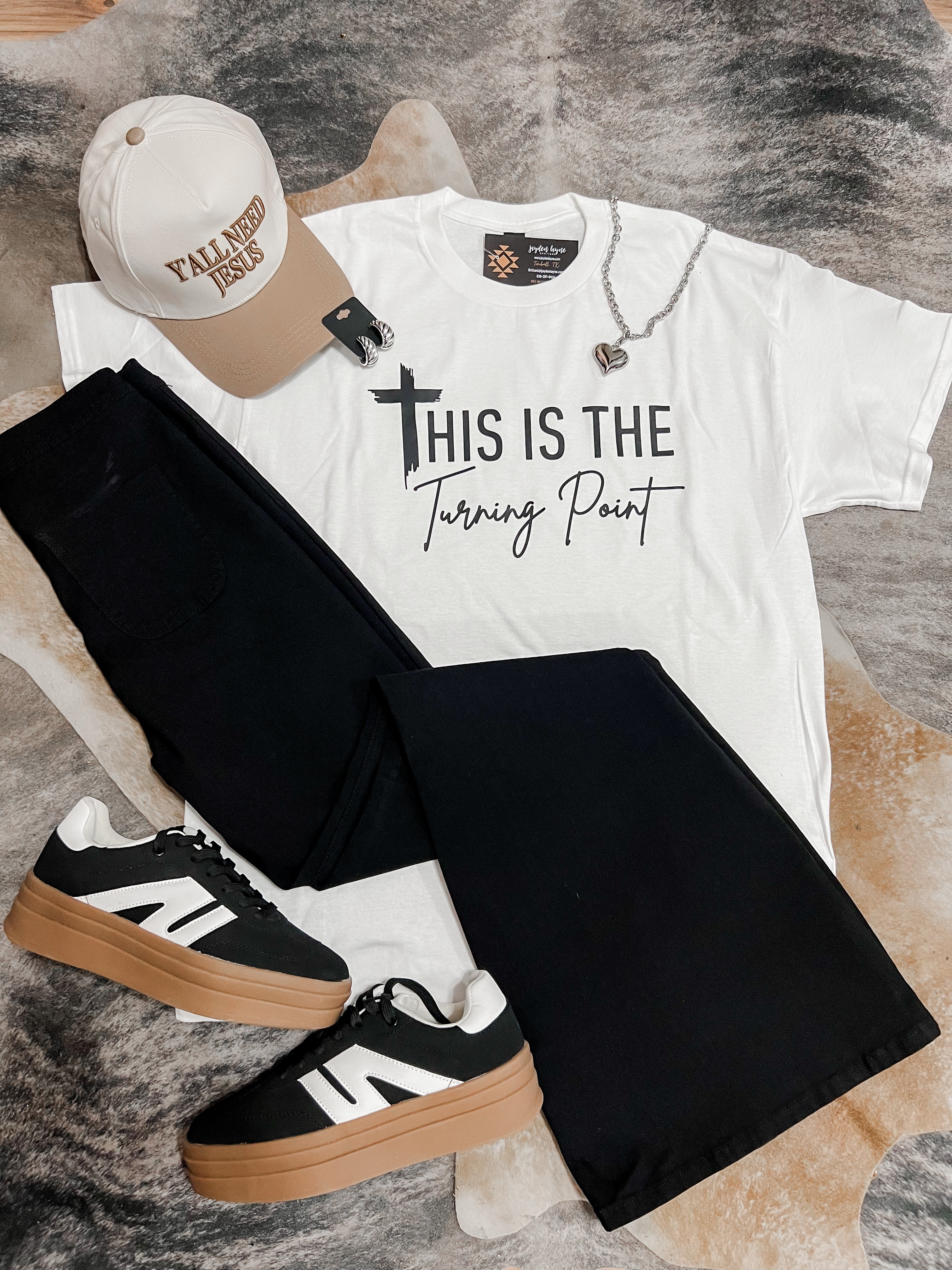 A simple statement with serious meaning — this white tee features bold black text that reads “This Is the Turning Point” with a cross graphic tucked beneath the words. Clean, classic, and easy to throw on when you want to say something without saying too much.