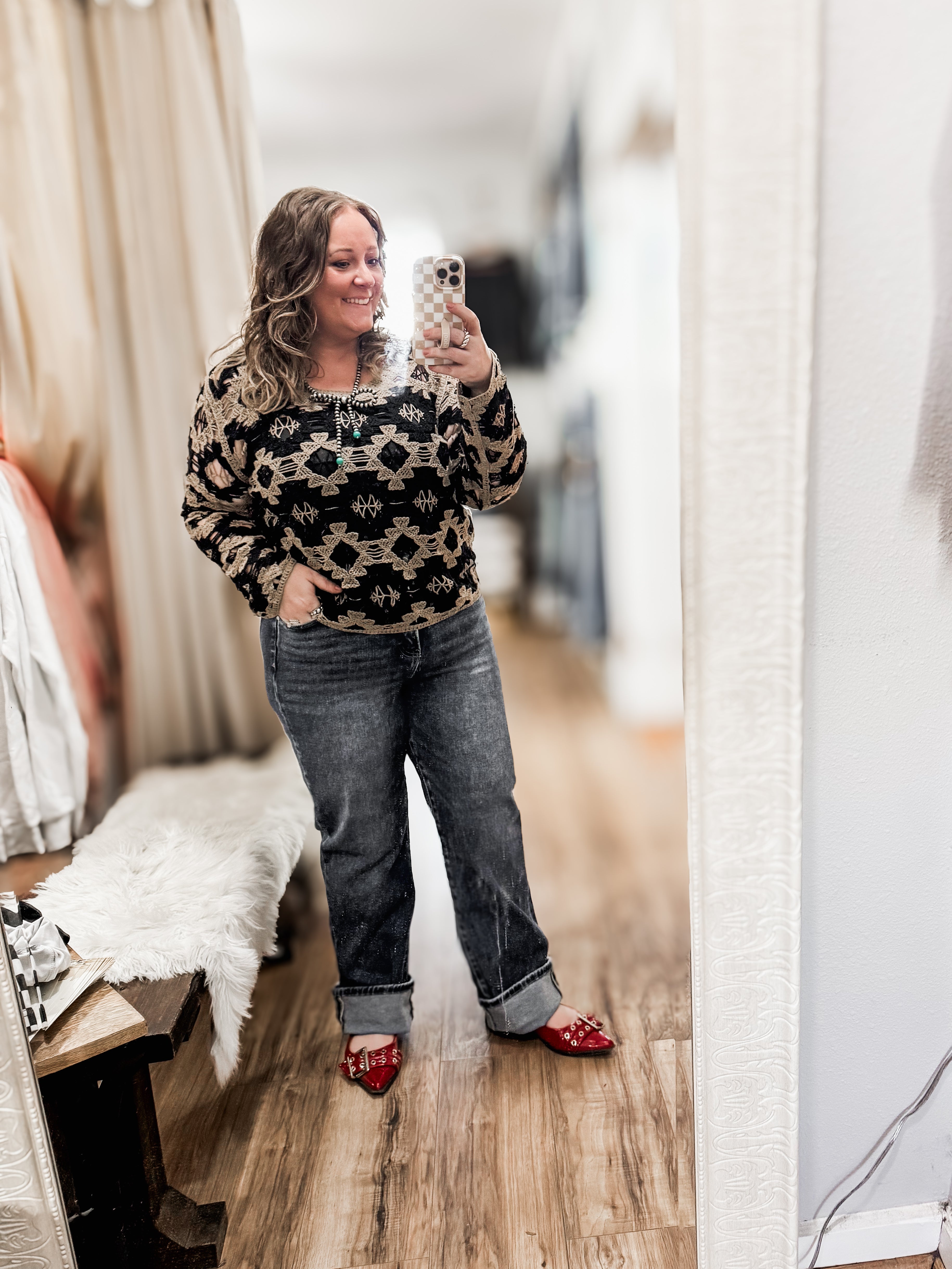 Boho meets western chic in this Black and Mocha Crochet Sheer Aztec Sweater Top — because who says cozy can’t be cool? The sheer crochet pattern shows off that perfect mix of edgy and feminine, and the included cami tank keeps it wearable for everyday mom life (or girls’ night if you’re lucky enough to escape).