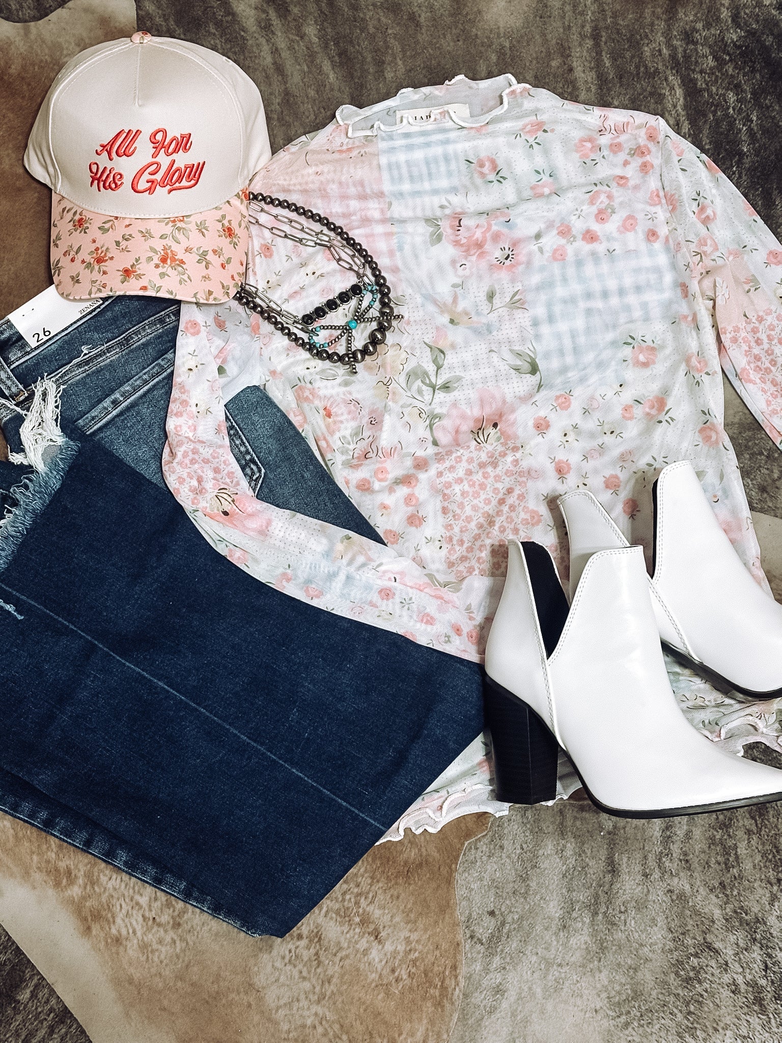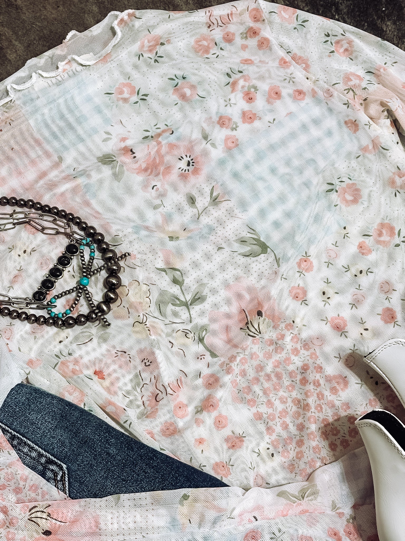 This high neck floral patchwork mesh top is the easiest way to make a basic outfit feel styled without trying too hard. The semi-sheer mesh gives you that layered look everyone loves, while the high neckline and long sleeves keep it wearable and flattering.
