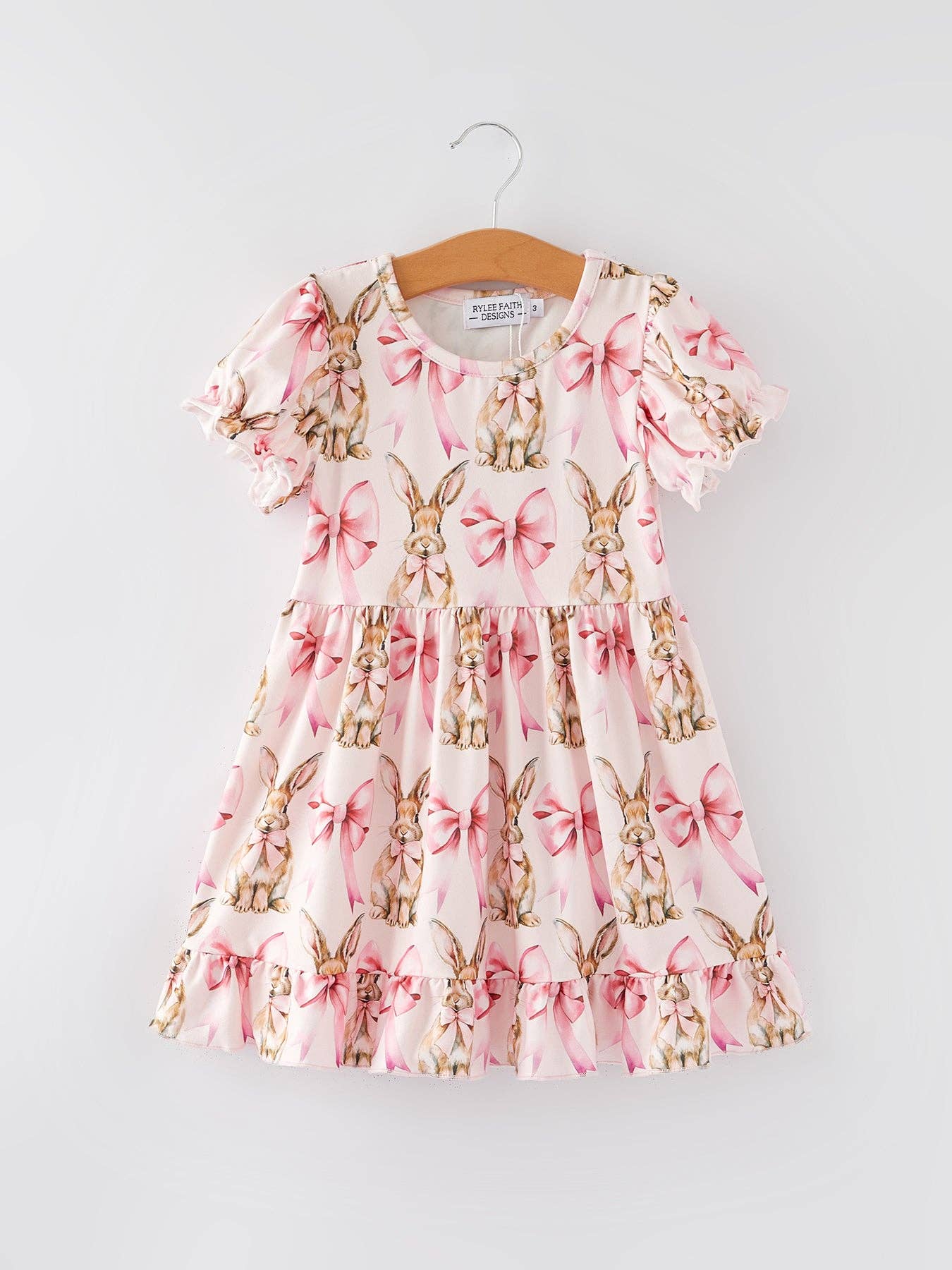 Easter Bunny Bow Print Puff Sleeves Girls Dress