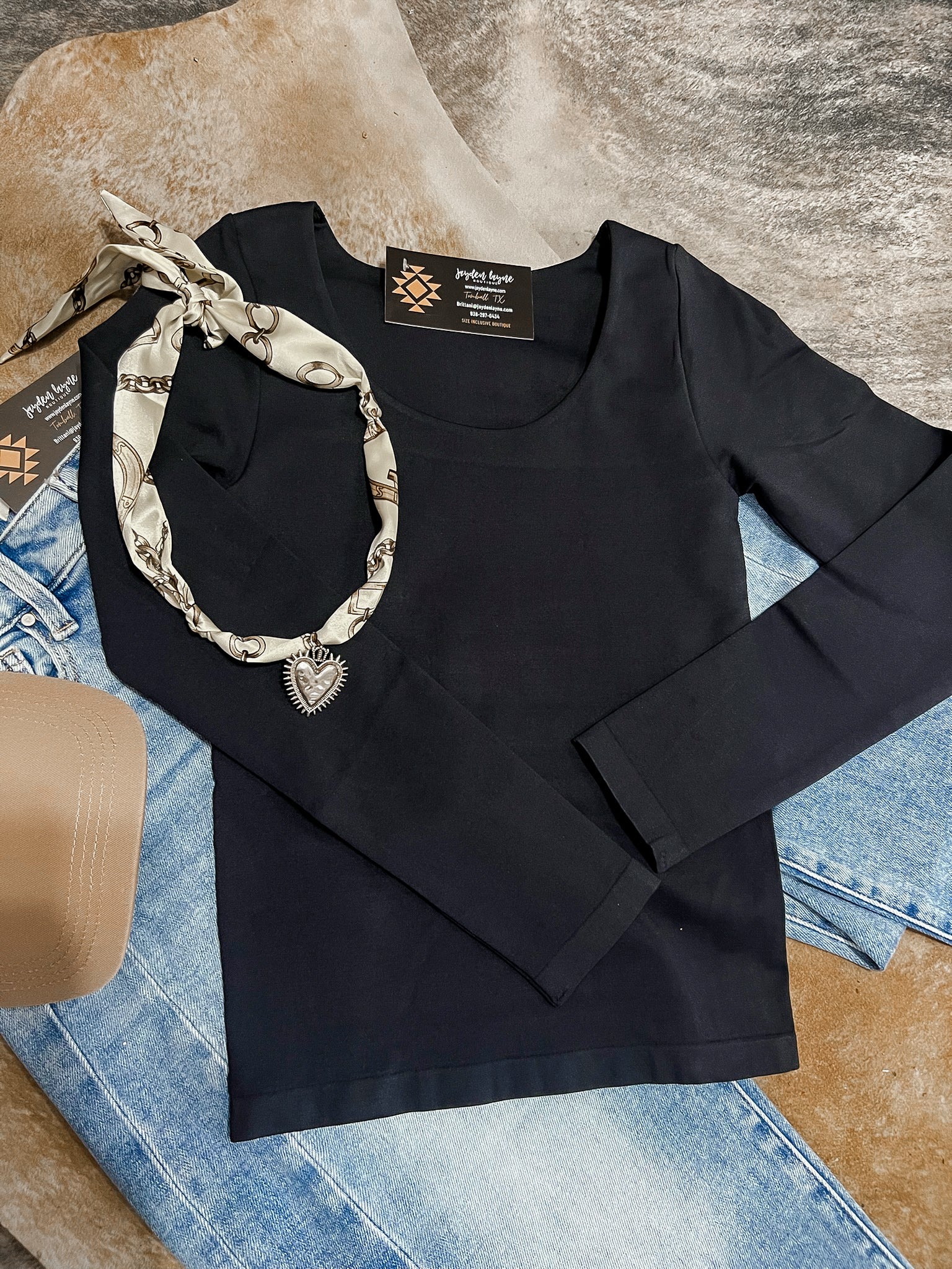 The ultimate upgrade to your closet staples—our Black Double-Layer Long Sleeve Round Neck Top. Designed with a sleek, full-length cut and crafted in our butter-soft fabric, this best-selling basic brings extra support and smoothing power thanks to its double layering. It’s flattering, comfortable, and made to move with you—whether you’re layering it under jackets or styling it solo.