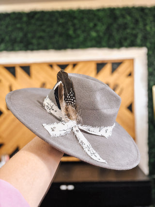 Custom Gray Wide Brim Hat with Floral Band & Feather Detail – Adjustable Western Hat