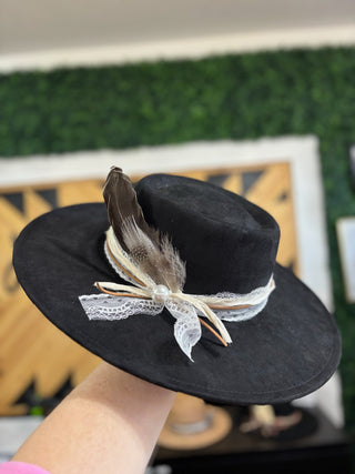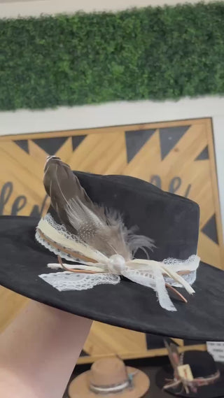 Custom Black Wide Brim Hat with Lace Band & Pearl Detail – Adjustable Western Statement Hat