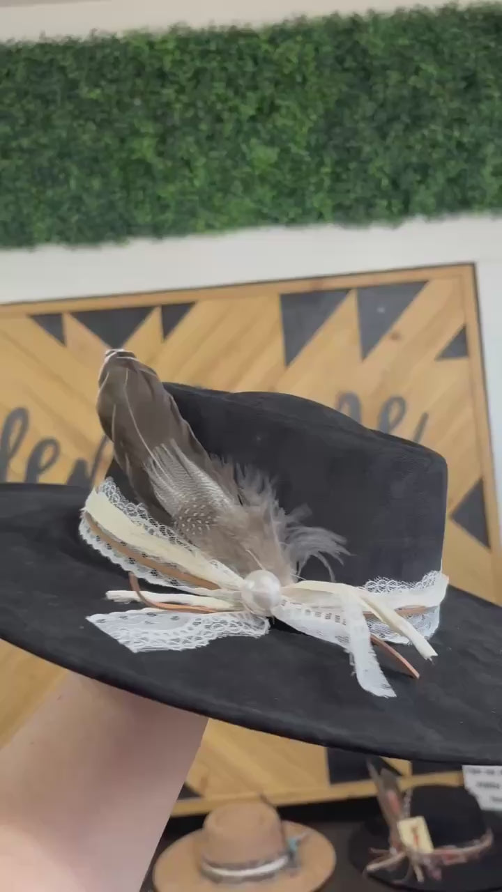 This custom black wide brim hat by Jayden Layne brings that clean, timeless base and layers it with soft lace, natural feather detail, leather accents, and a single pearl focal point that pulls it all together. It’s feminine with edge — the kind of hat that works just as well with a graphic tee and distressed denim as it does with a flowy dress and boots.
