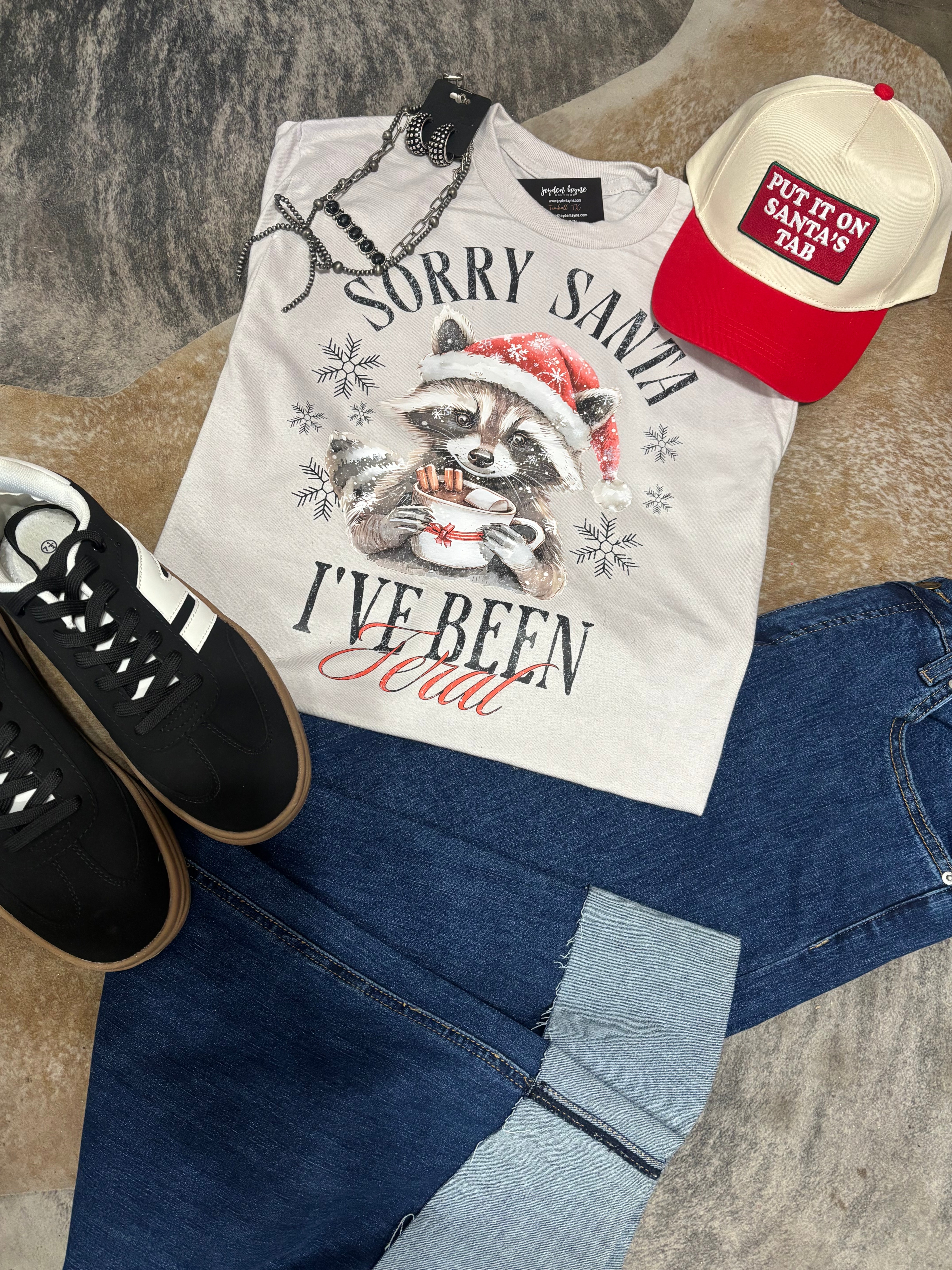 - Features the words ”Sorry Santa I’ve Been Feral” around raccoon graphic