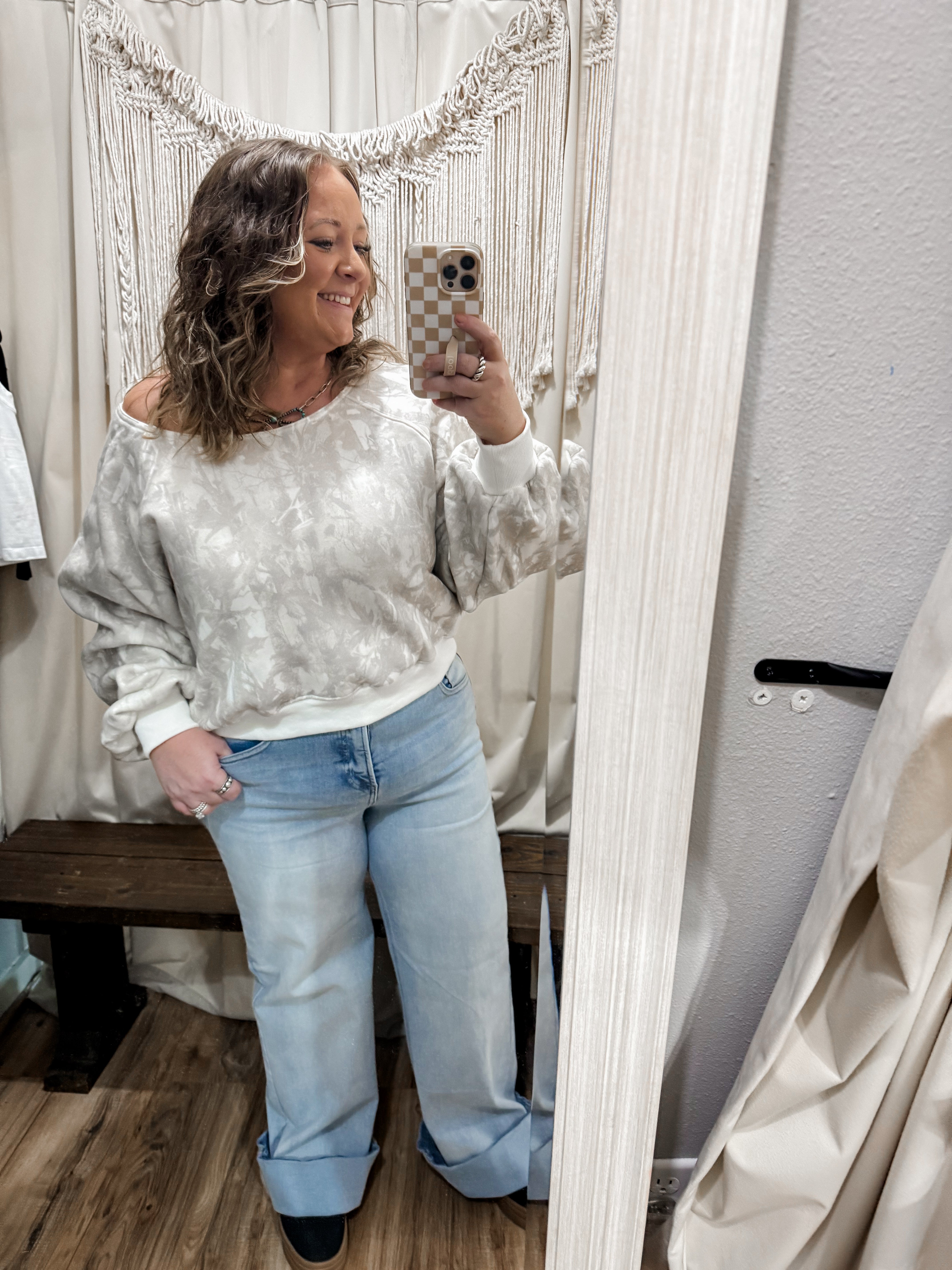 Beige camo boat neck pullover
