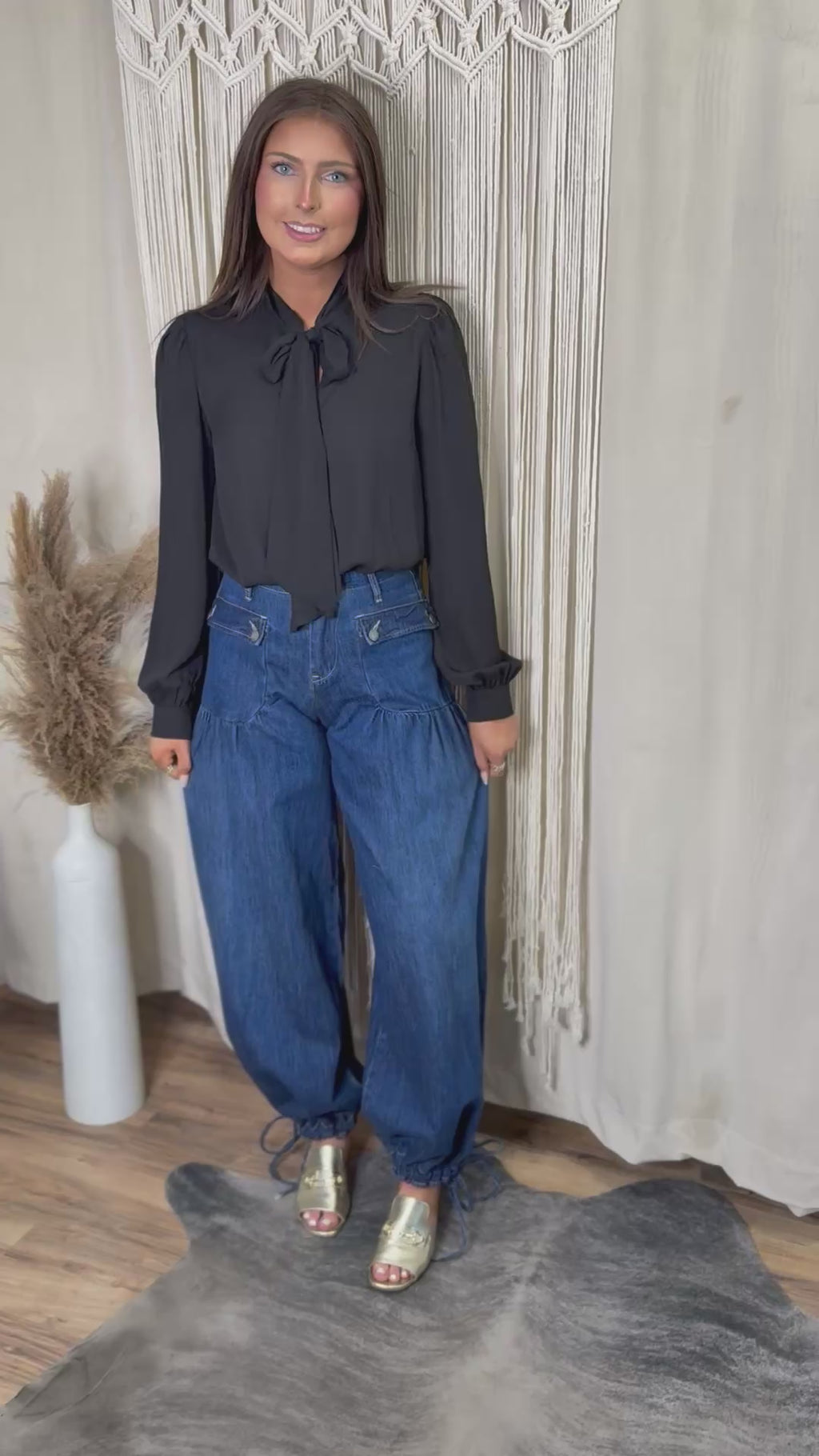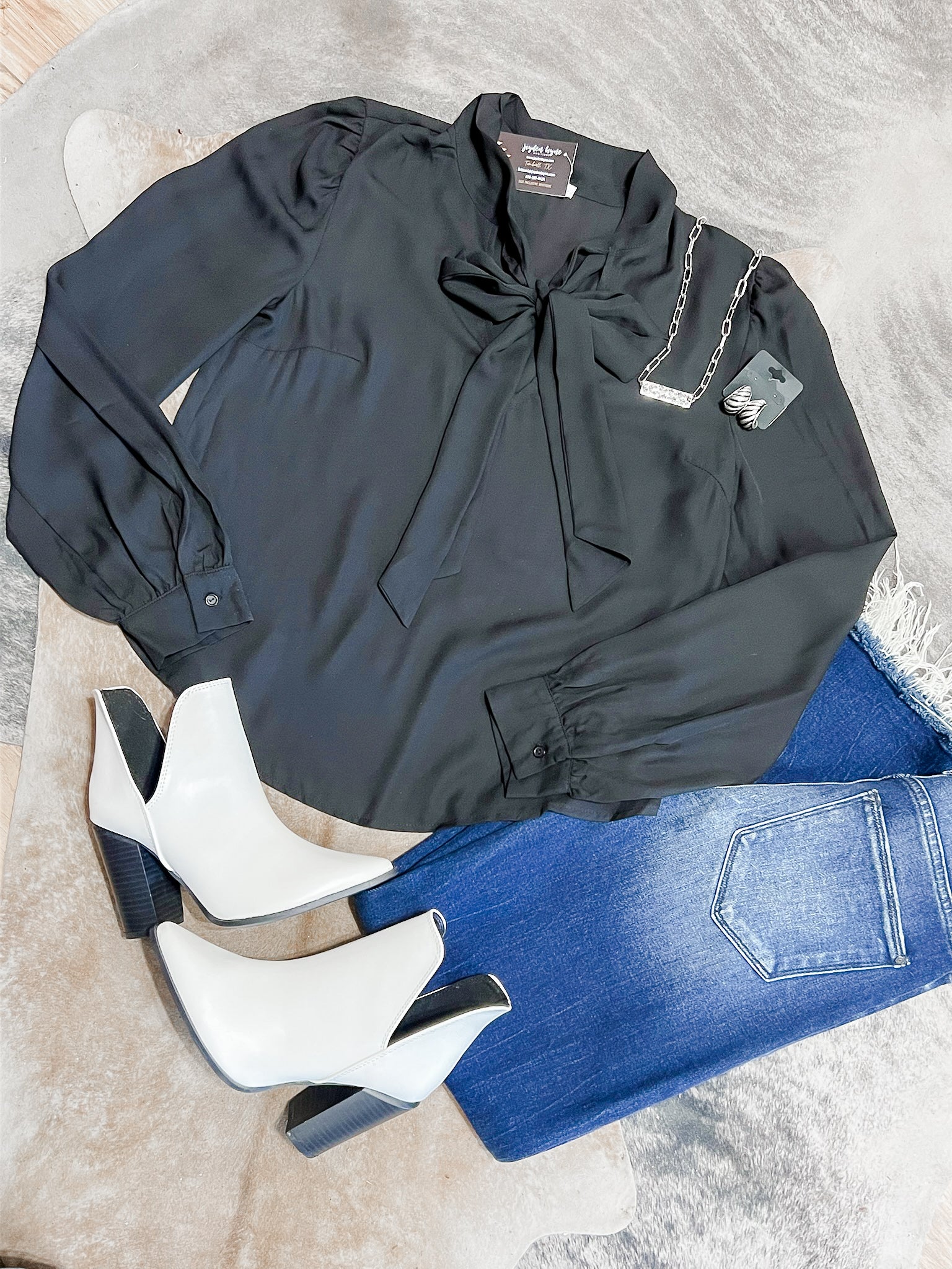Meet the blouse that instantly makes it look like you have your life together — classic black, long sleeves, a front tie bow, and cuffed sleeves for a clean finish. It’s effortless, feminine, and wildly easy to style whether you’re stacking bracelets, pairing with denim, or heading somewhere that requires you to behave.