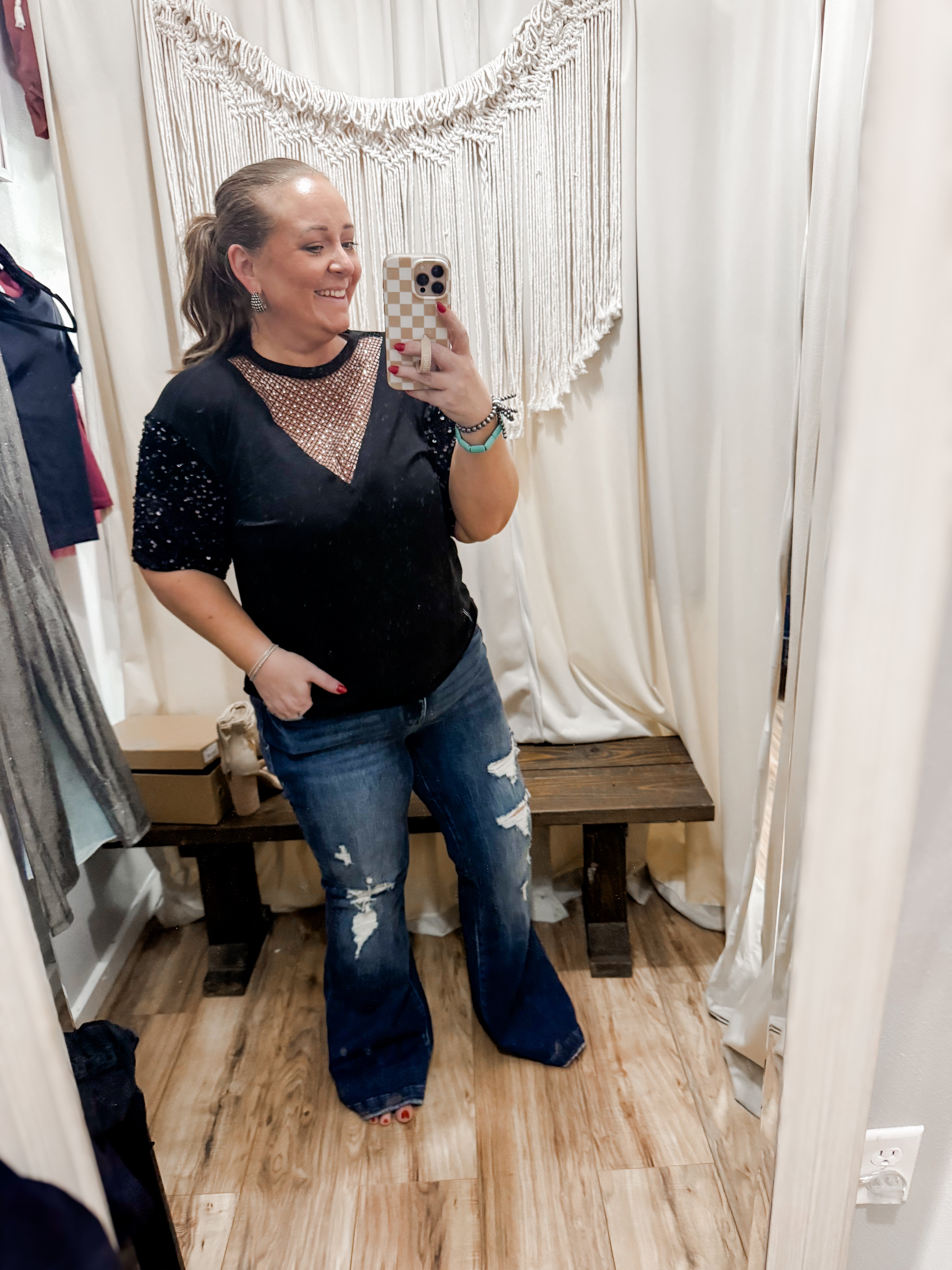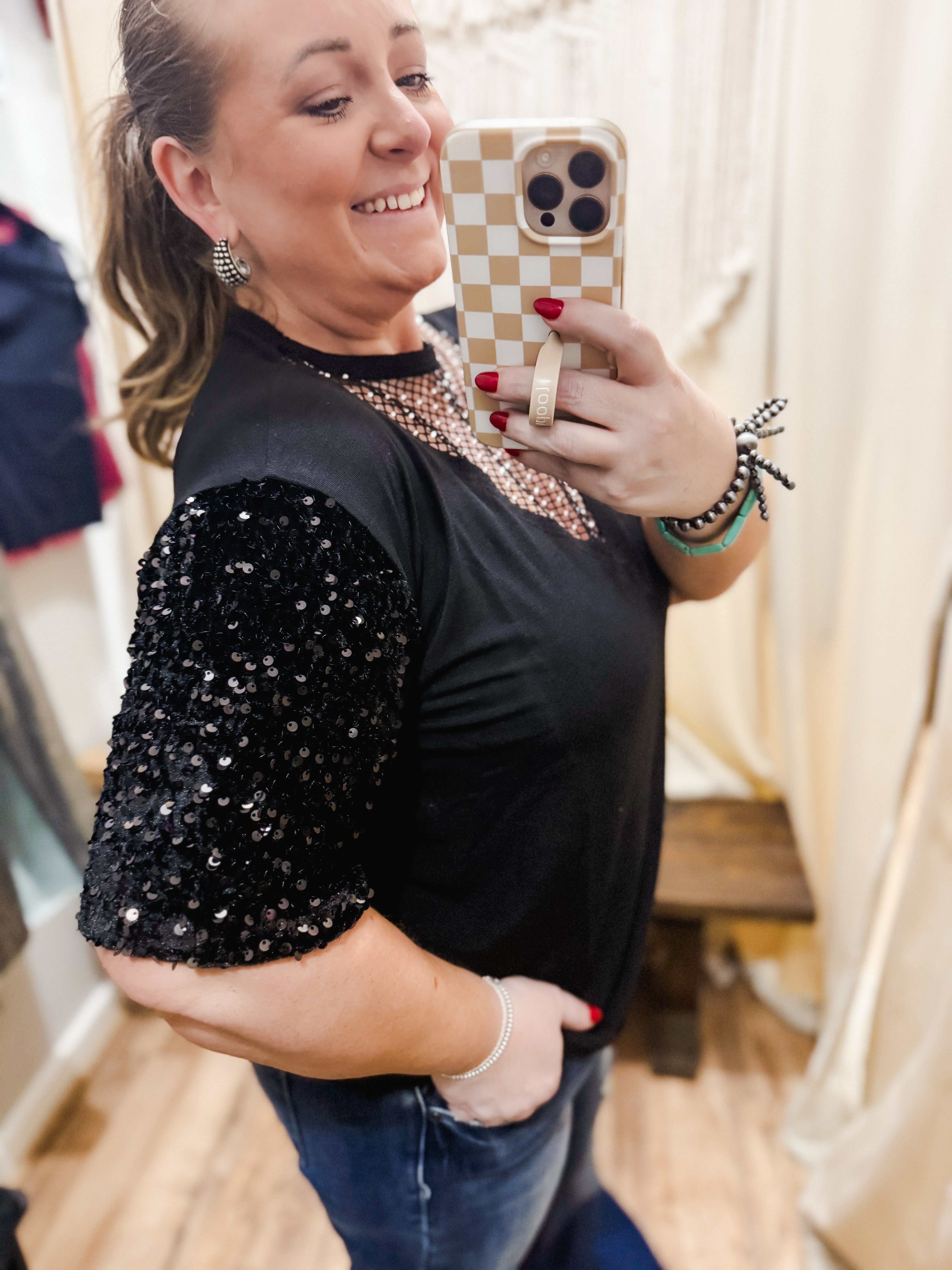 This oversized black mesh top is proof that subtle edge goes a long way. The silver sequin detailing stays right where it belongs — on the sleeves only, giving you sparkle without overwhelming the look. A mesh jewel V-neckline adds just enough drama while still fully covering the chest, making it bold but wearable. It’s edgy, confident, and effortlessly cool — perfect for concerts, nights out, or when your outfit needs a little attitude.