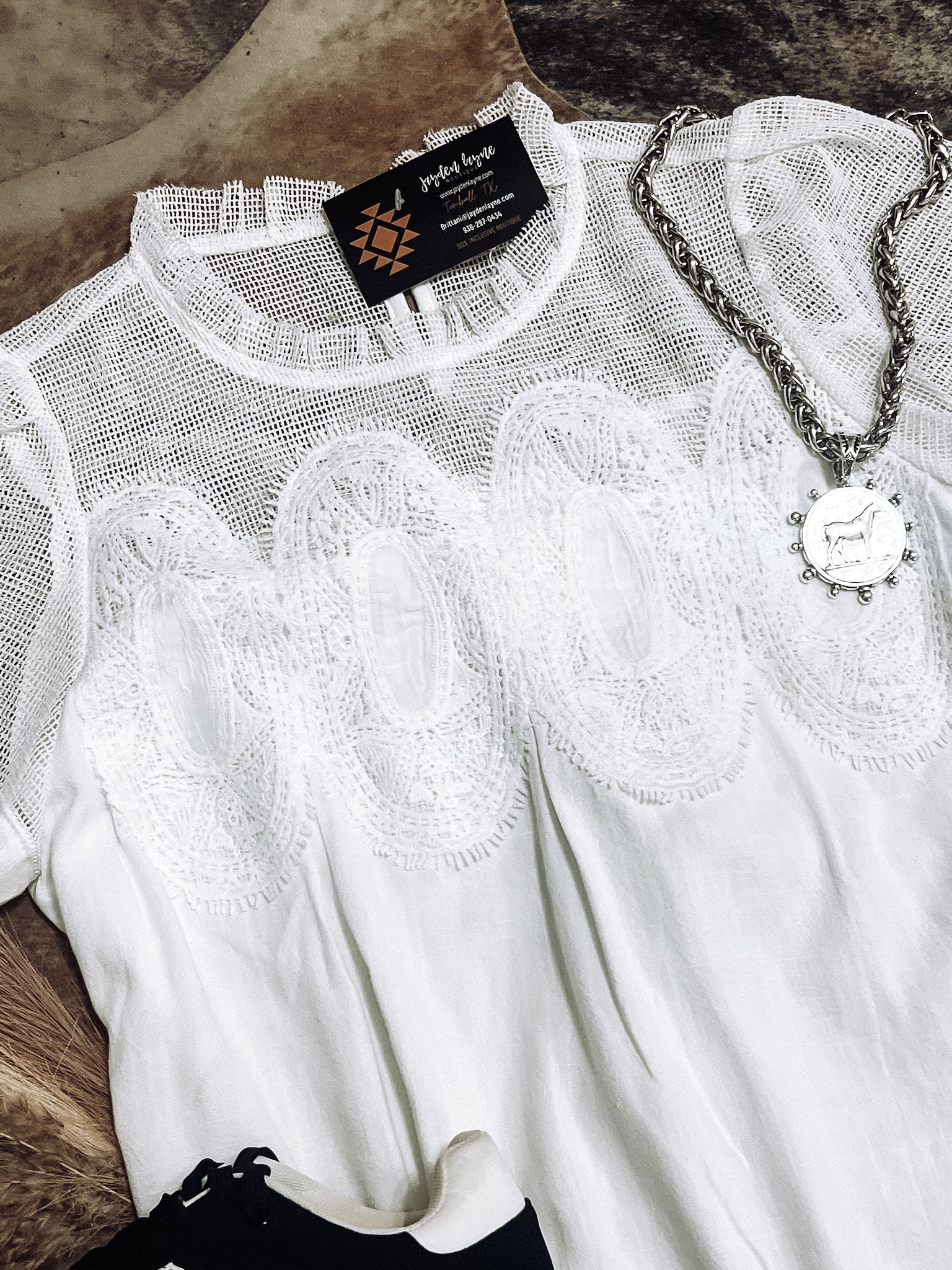 The lace paneling + textured mesh neckline gives elevated without trying too hard. Pair it with cutoffs for everyday casual or tuck it into denim for dinner and drinks.