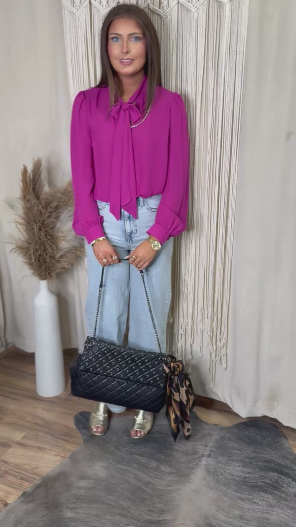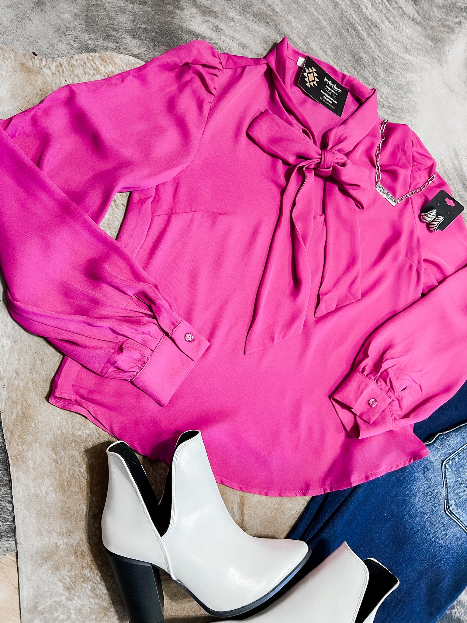 Meet the top that screams “yes, I have my life together” even if you were sweating through school drop-off five minutes ago. This magenta long sleeve blouse features a dramatic front tie bow (flirty but not try-hard) and cuffed sleeves for that polished, elevated-casual vibe we love.