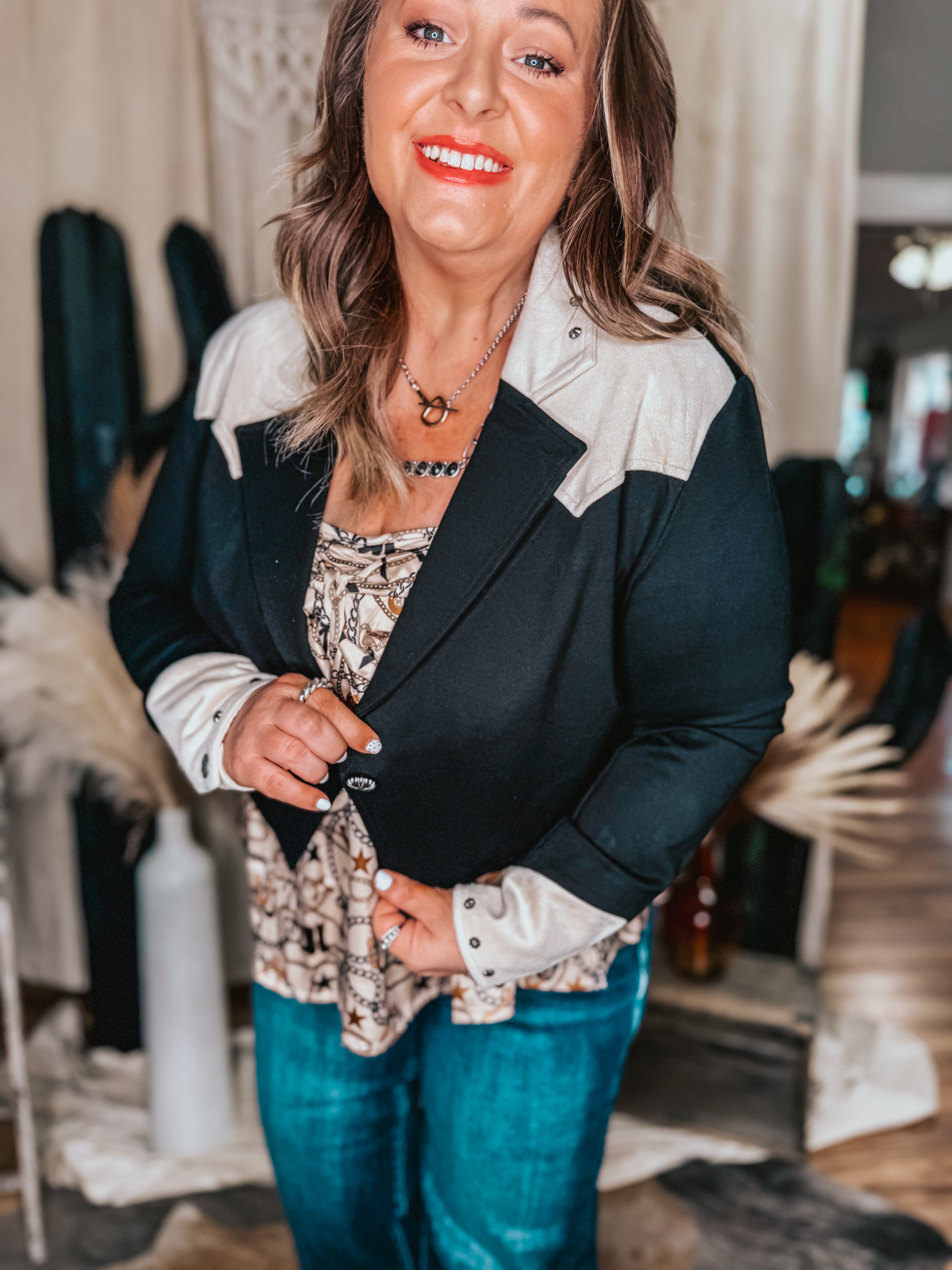 Layer it over a fitted tank, satin top, or babydoll blouse. Pairs perfectly with denim, skirts, or dress pants. Finish the look with boots and silver jewelry for an effortless western vibe.
