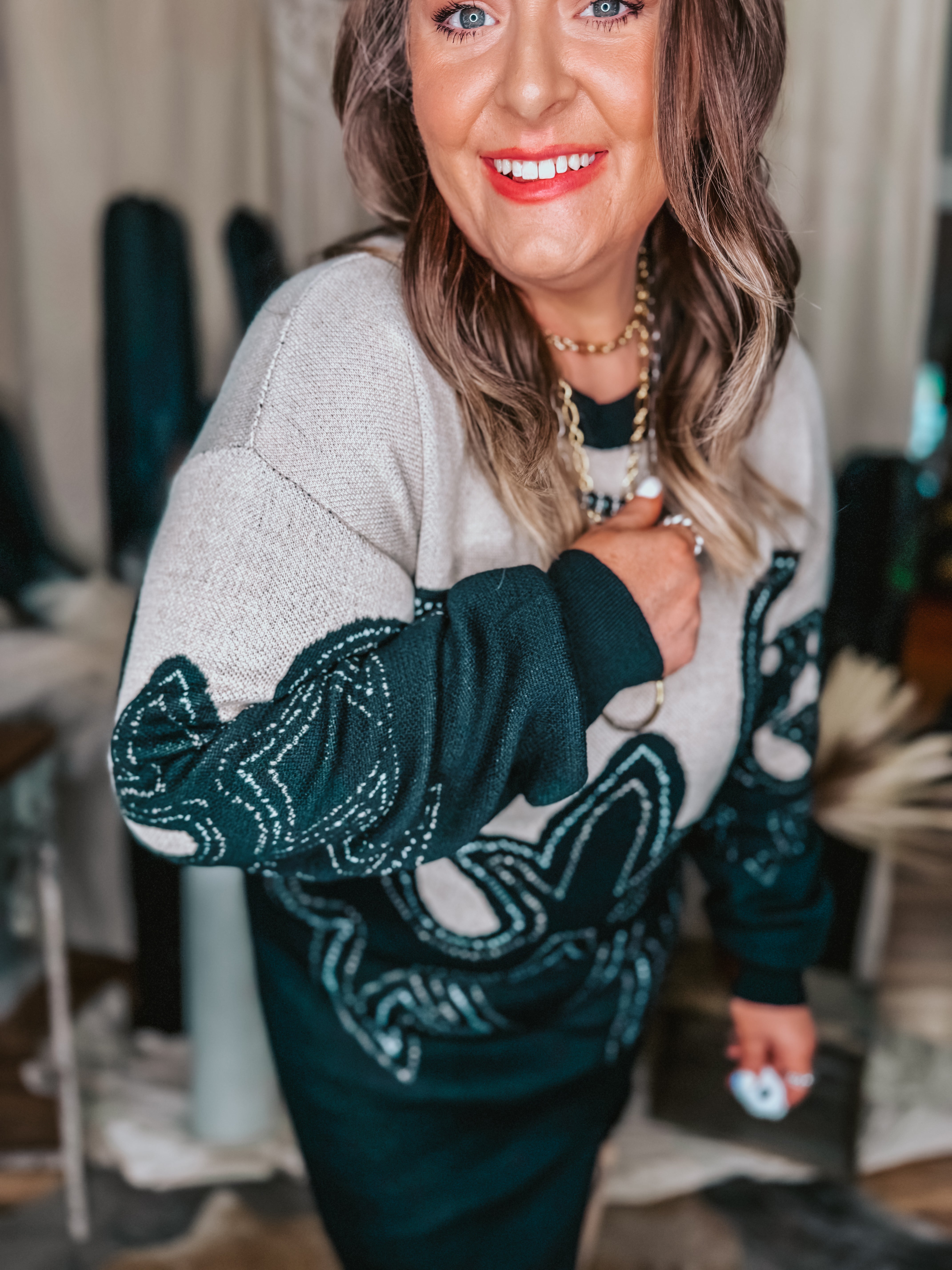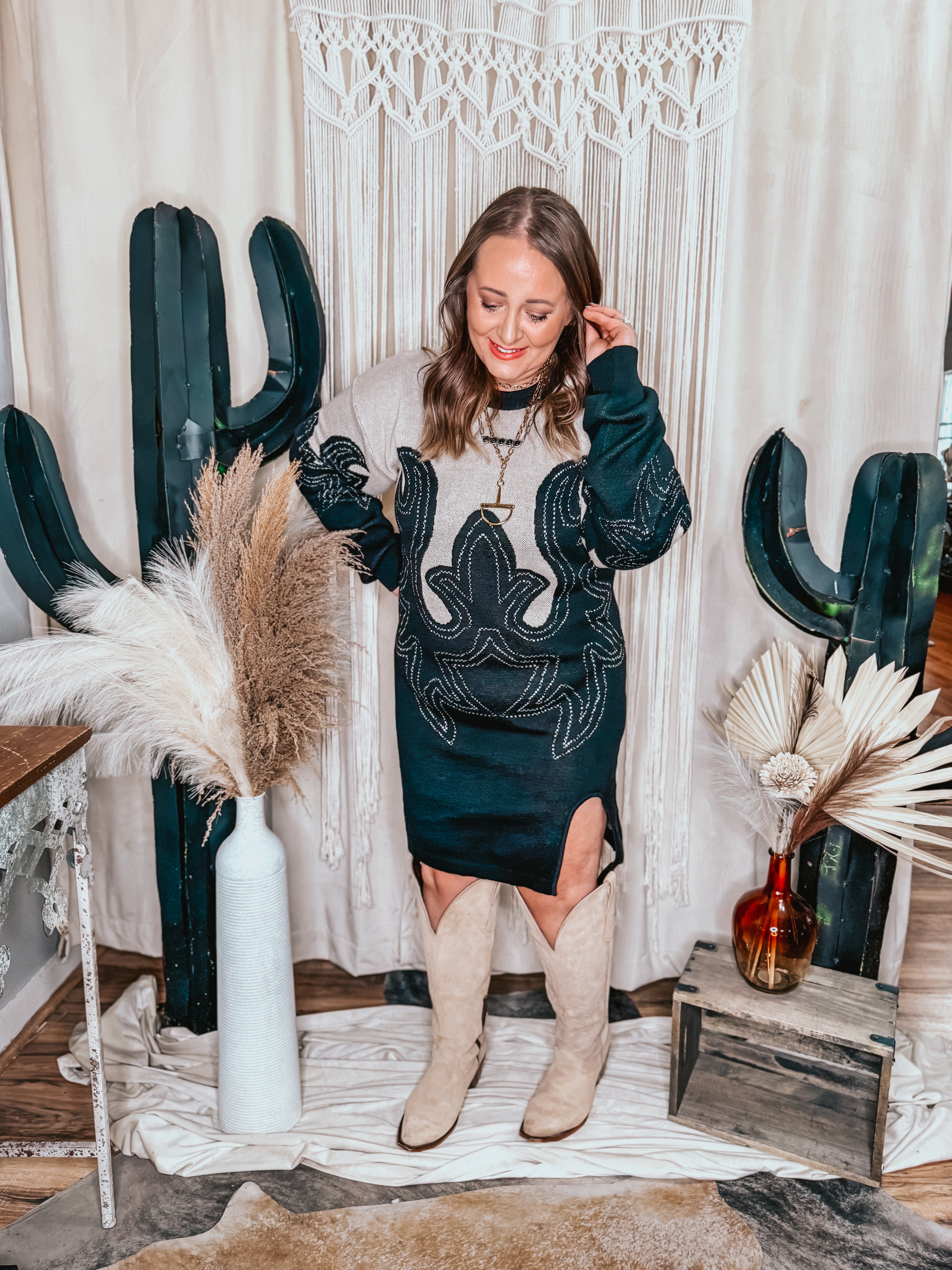 This is the dress you grab when you want western vibes without feeling overdone. Soft sweater knit, an eye-catching western-inspired design, and a relaxed fit that still shows off your shape. The side slit gives it movement (and boot moment energy), while the longer length keeps it wearable and comfortable.