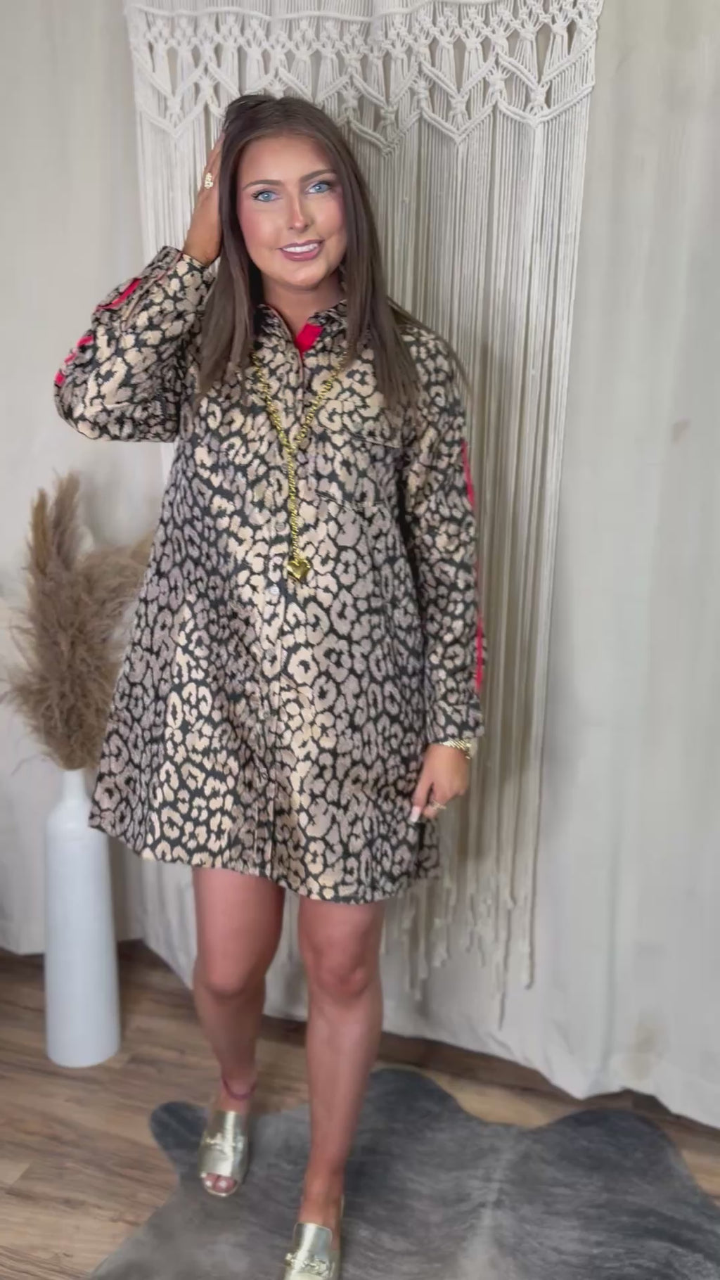 This metallic leopard midi dress is for the days you want to look pulled together without trying too hard. The bold animal print is balanced with rich red contrast details, giving it a polished, intentional look that works for workdays, dinners, and everything in between. The button-down design and midi length make it flattering, forgiving, and wearable — aka the kind of piece you’ll keep reaching for.